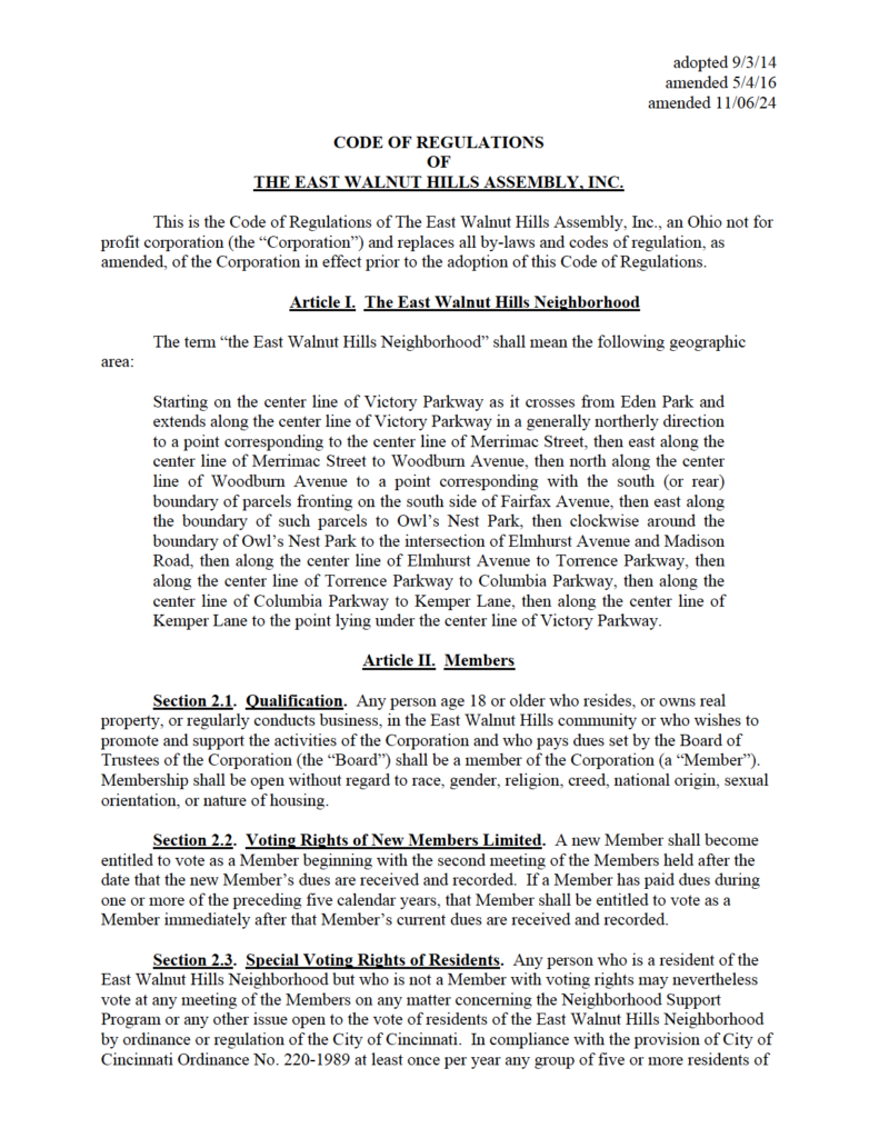 East Walnut Hills Assembly Code of Regulations Download the East Walnut Hills Assembly Code of Regulations (PDF format).